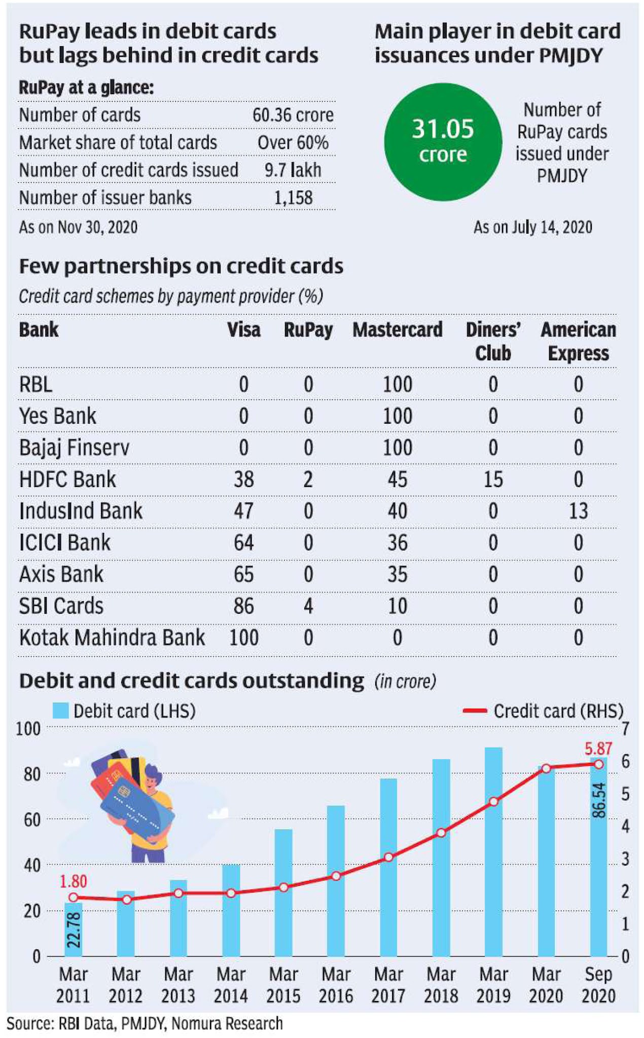 • RuPay story: It is a product of the National Payments Corporation of India (NPCI), launched in 2012 as the country’s domestic card payment network. It is a market leader in terms of overall card issuances but lags behind in credit cards and spends. By November 30, 2020 there were 60.36 crore RuPay cards issued and it had a total market share of over 60 per cent of the total cards issued. Most were debit cards with only 9.7 lakh credit cards issued as on November 30, 2020. Visa has the second largest issuance of cards followed by Mastercard.
