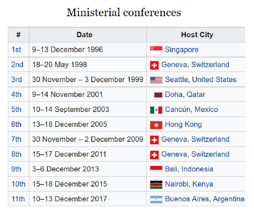 विश्व व्यापार संगठन की ग्यारहवीं मंत्री-स्तरीय वार्ता दिसंबर 2017 में अर्जेंटिना में हुई। सन 2020 में मंत्री-स्तरीय सम्मेलन आयोजित करने वाला कज़ाकस्तान पहला मध्य-एश्यिई देश बना