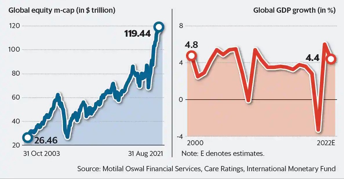 4. Despite sluggish earnings growth and weak fundamentals, global equity market capitalization has shot up 75% to $119 trillion from the lows of March 2020.